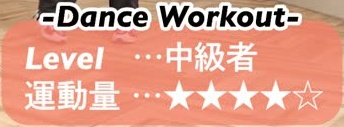 | 0:01.3–0:04.2 | r003 | orange_beige_2 | -Dance Workout- Level …中級者 運動量…★★★★☆ | -Dance Workout- 等级…中级 运动量…★★★★☆ | ーダンスワークアウトー レベル…中級 運動量…★★★★☆ | -Dance Workout- Level…Intermediate Intensity…★★★★☆ | |